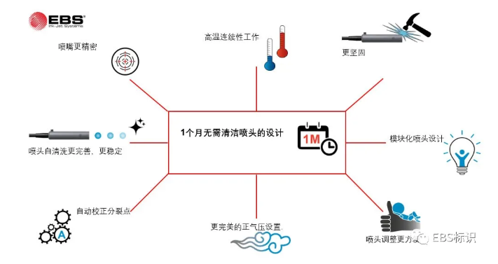 EBS流水線小字符噴碼機能夠智能適應各種環境變化的設計,24小時穩定生產。保證企業生產穩定進行。全新的噴頭結構化模塊設計,雙噴頭電磁閥,清洗閥門設計,配合全新工藝的紅寶石激光打孔工藝,噴嘴孔徑圓潤,不堵塞噴嘴。